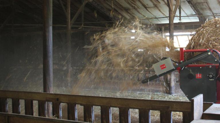 Positionnés au plus près du démêleur, les peignes créent une gerbe montante de paille régulière et sans paquet. Cela permet de pailler au-dessus des cornadis et barrières, jusqu'à 1,80 m, voire plus, suivant l'engin porteur.