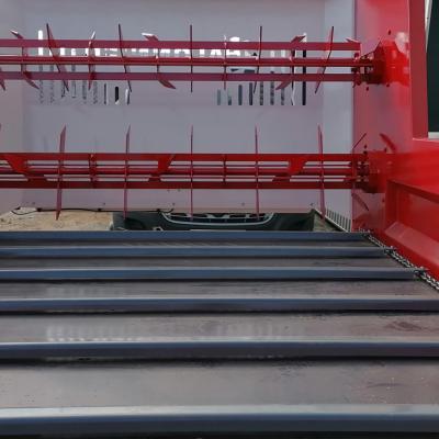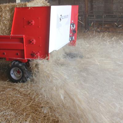 Le tapis à barrettes avec régulation de vitesse fait avancer la paille vers les deux rouleaux démêleurs à dents fixes. L'agressivité de ces deux rotors permet de démêler les balles les plus difficile en supprimant les phénomènes de "paquets". Le front d'attaque important permet aux rouleaux démêleurs d'avoir un débit de chantier élevé. Une hotte de guidage dirige ensuite la paille vers le dispositif de paillage à disques.